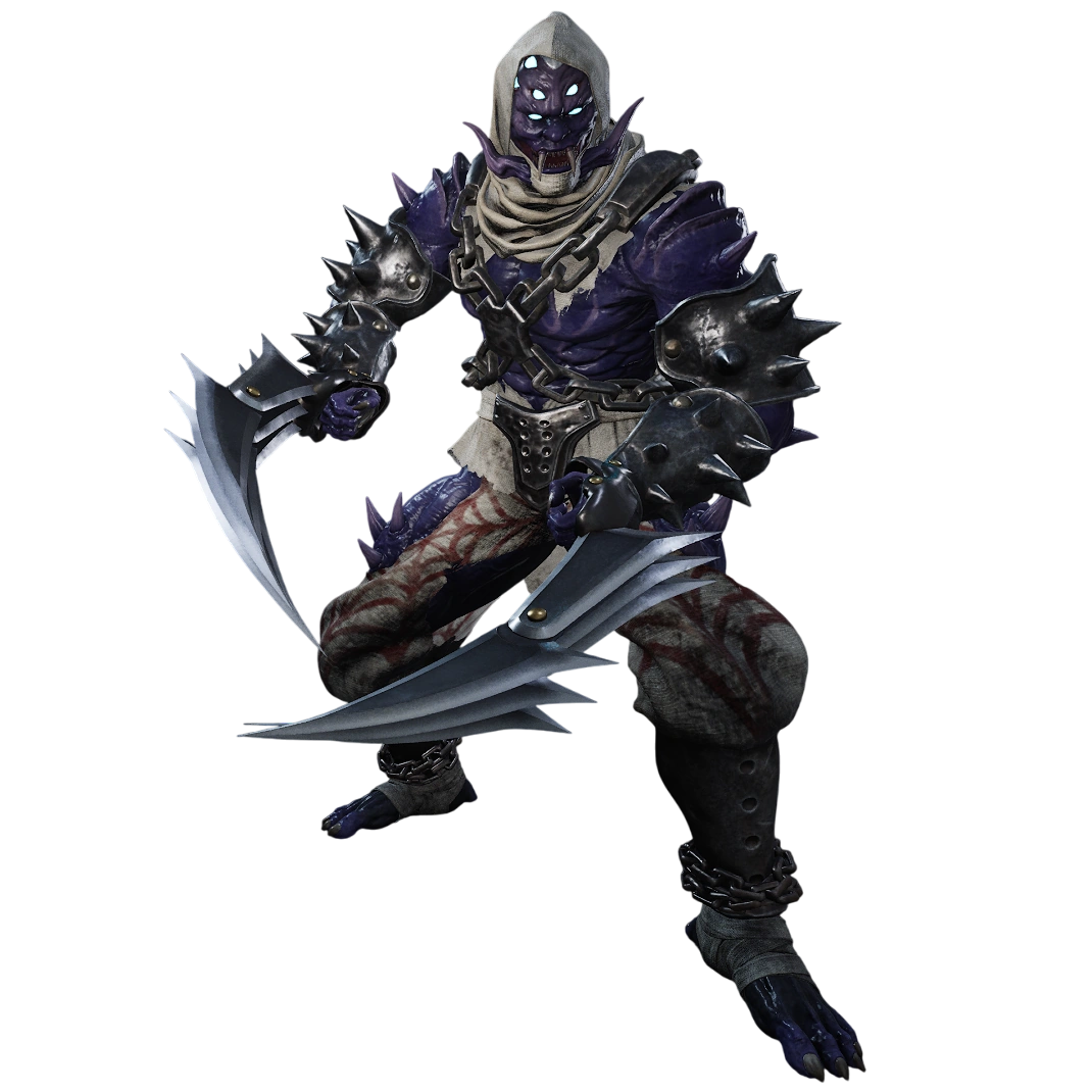 When turned into a Fiend, the skin of Talons Ninja turns a cadaveric blue through their tattered white robes. Their hooded face morphs into the war mask they used to wear, featuring a fanged slit-mouth and multiple eyes. Sharp spikes burst out of their arm plates and their ankles and torso are bound by chains.