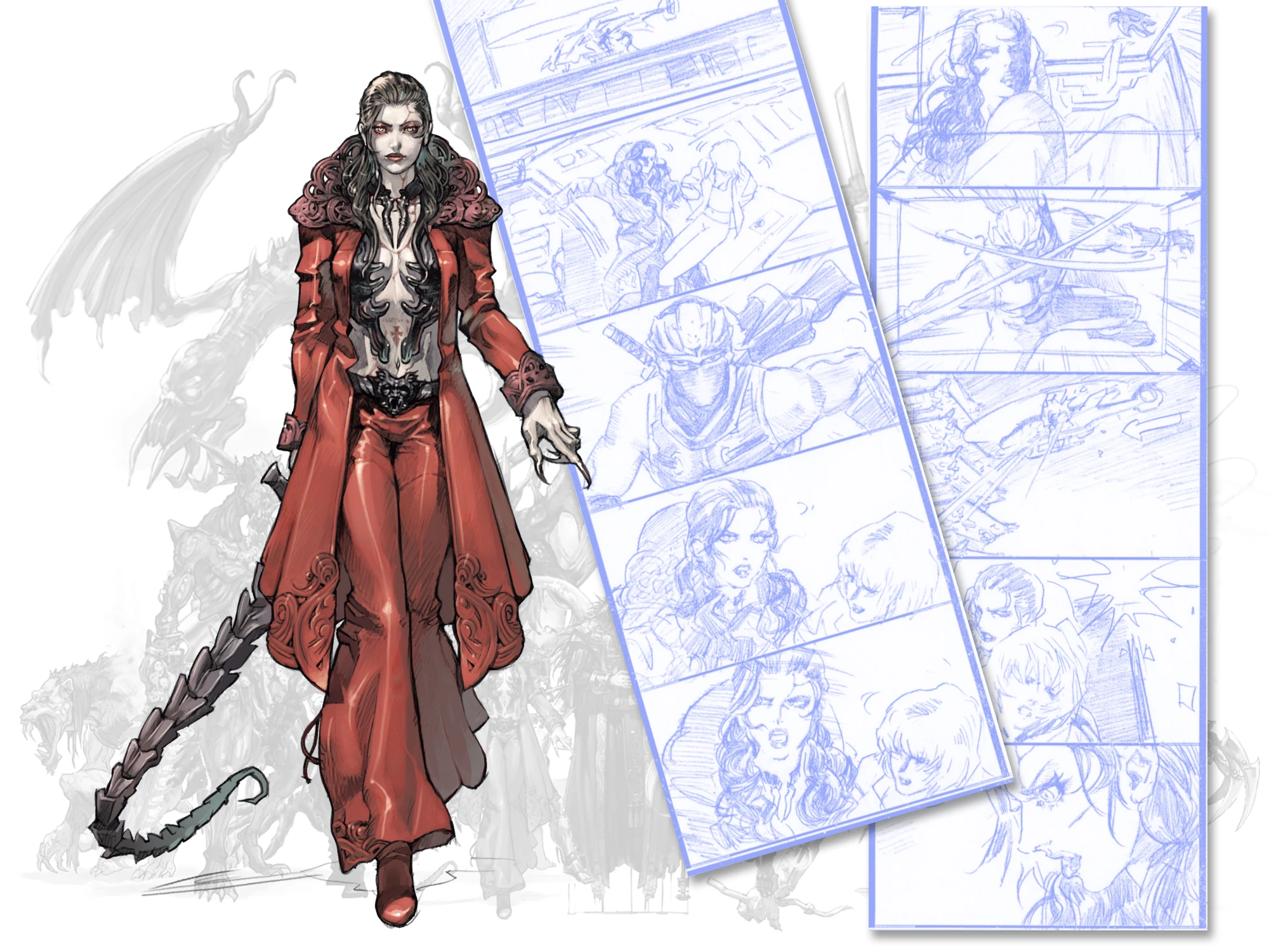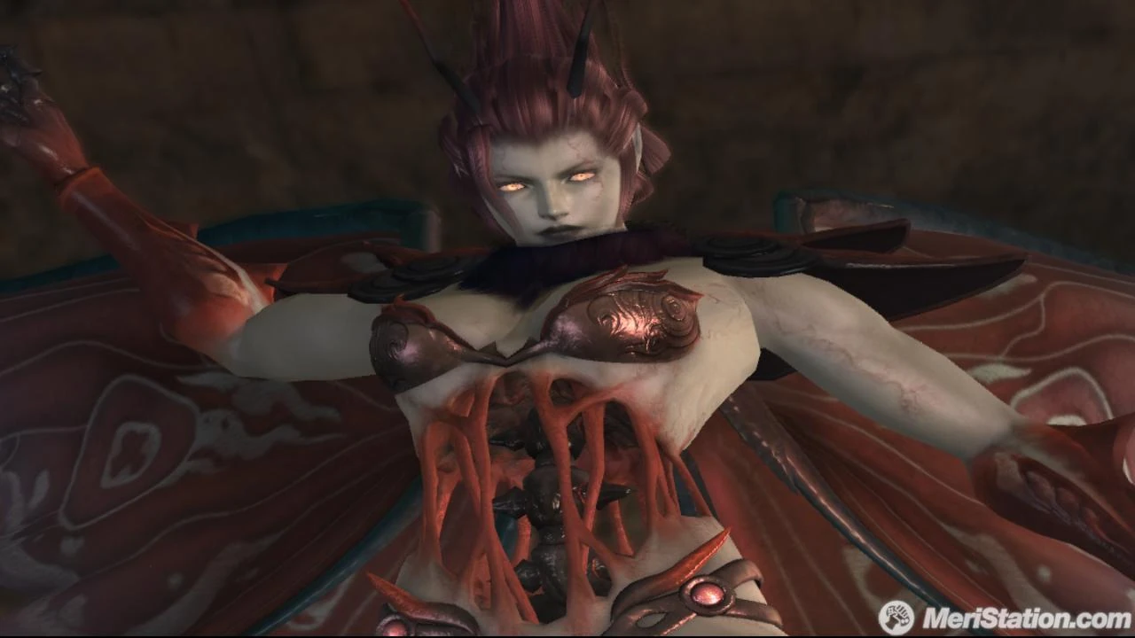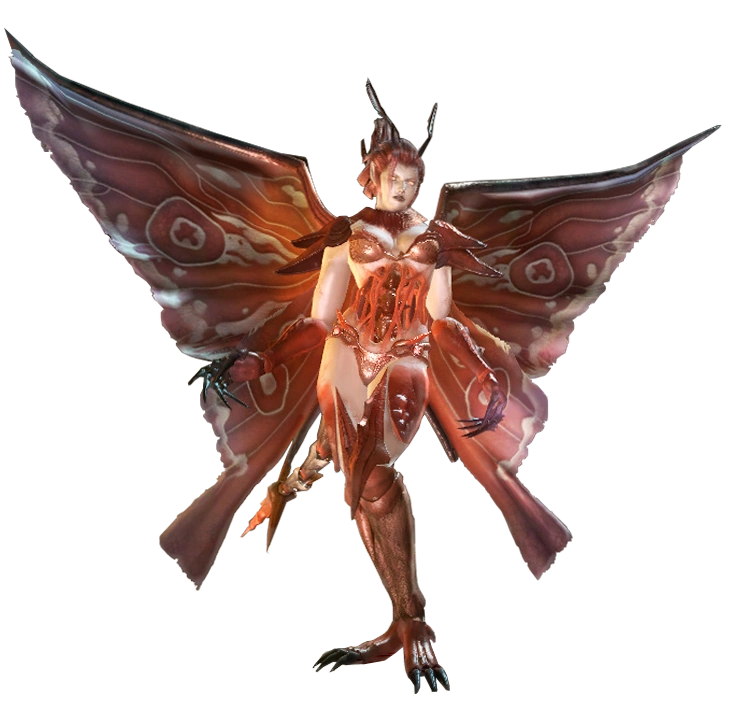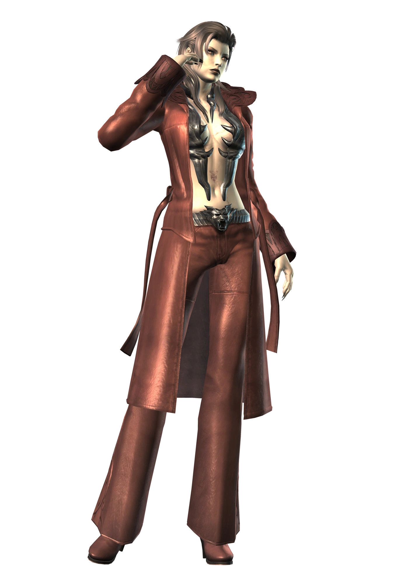 Elizébet is a Fiend female of average height having light brown hair and eerily striking clear golden eyes, she wears a blood-colored red overcoat that remains open and exposes her chest and midriff. Around her chest she wears black garments around her breast that seems to be materialized greatly around her midriff she has an insignia tattoo above her navel, she wears baggy red pants to match her overcoat and red-heeled shoes. Later in the game she strips her clothes down to what's left of her garment and fully nude before transformation. Elizébet's fiendish form makes her resemble a more dragon or scorpion appearance having a tail and wings. Her stomach appears to be ripped off showing only spinal bone; her hair also turns red and she gains claws and red shoulder guards.