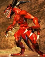 A large red devilish bipedal dinosaur like creature, with claw arms, 2 horns, muscled chests, dinosaur like jaws and a reptilian tail. They are twice the height of a human.