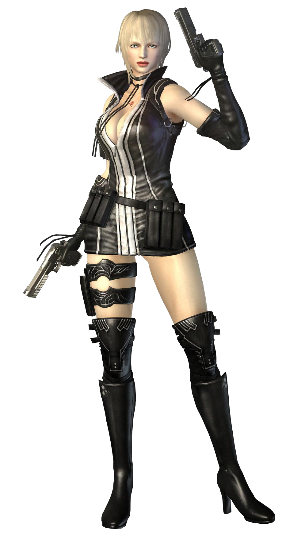 Irene is an attractive and voluptuous young woman with pale skin, short platinum blonde hair and green eyes. She wears a low-cut black leather outfit with vertical whites strips down the front, long black gloves, and thigh-high heeled black boots. She also has several storage weapon holsters on belts around her waist, right arm and right thigh, along with a small red tattoo above her breasts.