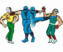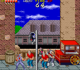 The controls of the game consists of an eight-way joystick and three action buttons: Grab, Attack, and Jump. The Grab button is located on top of the joystick itself. The player character has five main techniques: The "Triple Blow Combination" is the player's primary attack, performed by pressing the attack button repeatedly while the player is standing on the ground. While jumping towards an adversary, the player can do a "Flying Neck Throw"; throwing an enemy into a background object (such as trash cans, phone booths, or signs) will cause different power-ups to appear, such as health restoring pills or a sword that can be wielded for a limited time. While standing near overhead signs or bars, the player can hang unto them by pressing the Grab button and perform a "Hang Kick". While overhanging on a bar, the player can also move by performing a "Tightrope Walk". The last of the five techniques is the "Phoenix Backflip", in which the player runs towards the wall and performs a backflip.