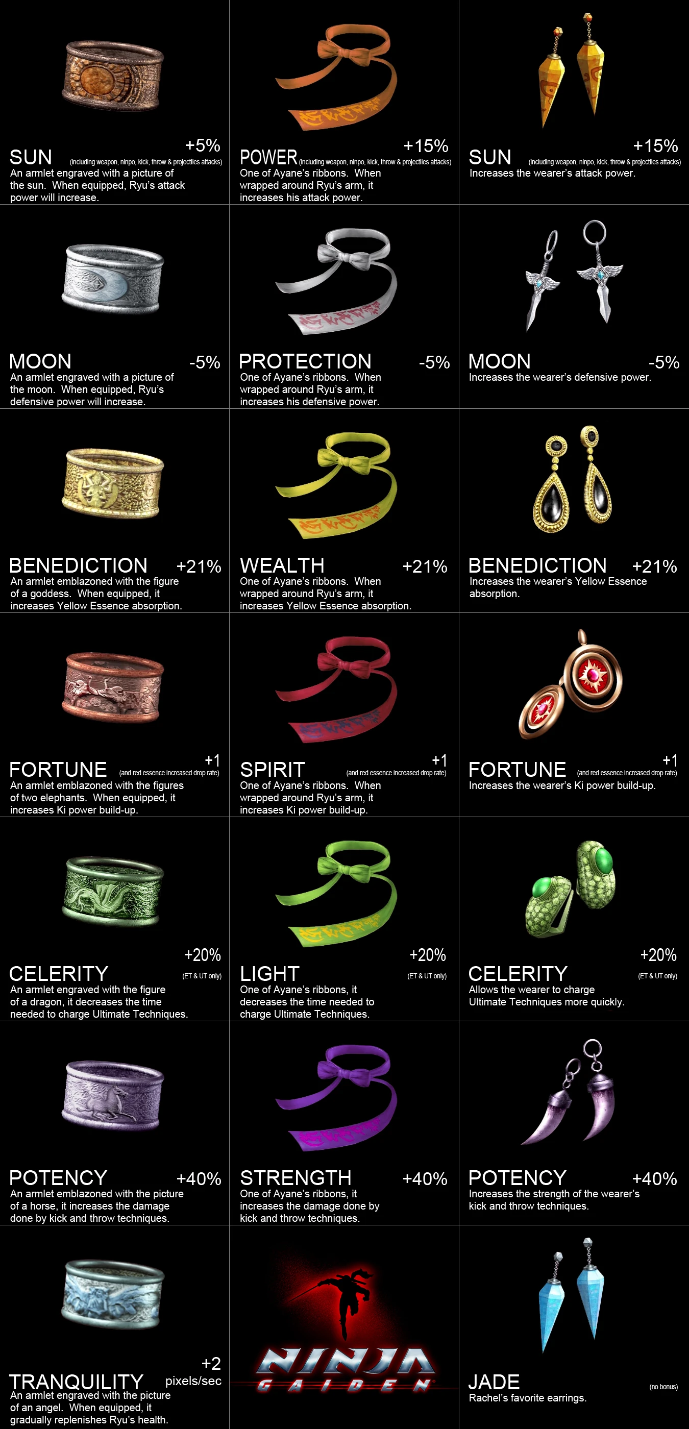 - Armlet of the Sun: An orange armlet engraved with a picture of the Sun, when equipped increases Ryu's attack power by 5%. Applies to all attacks, including melee weapon attacks, projectile attacks, ninpos, kick & throws.