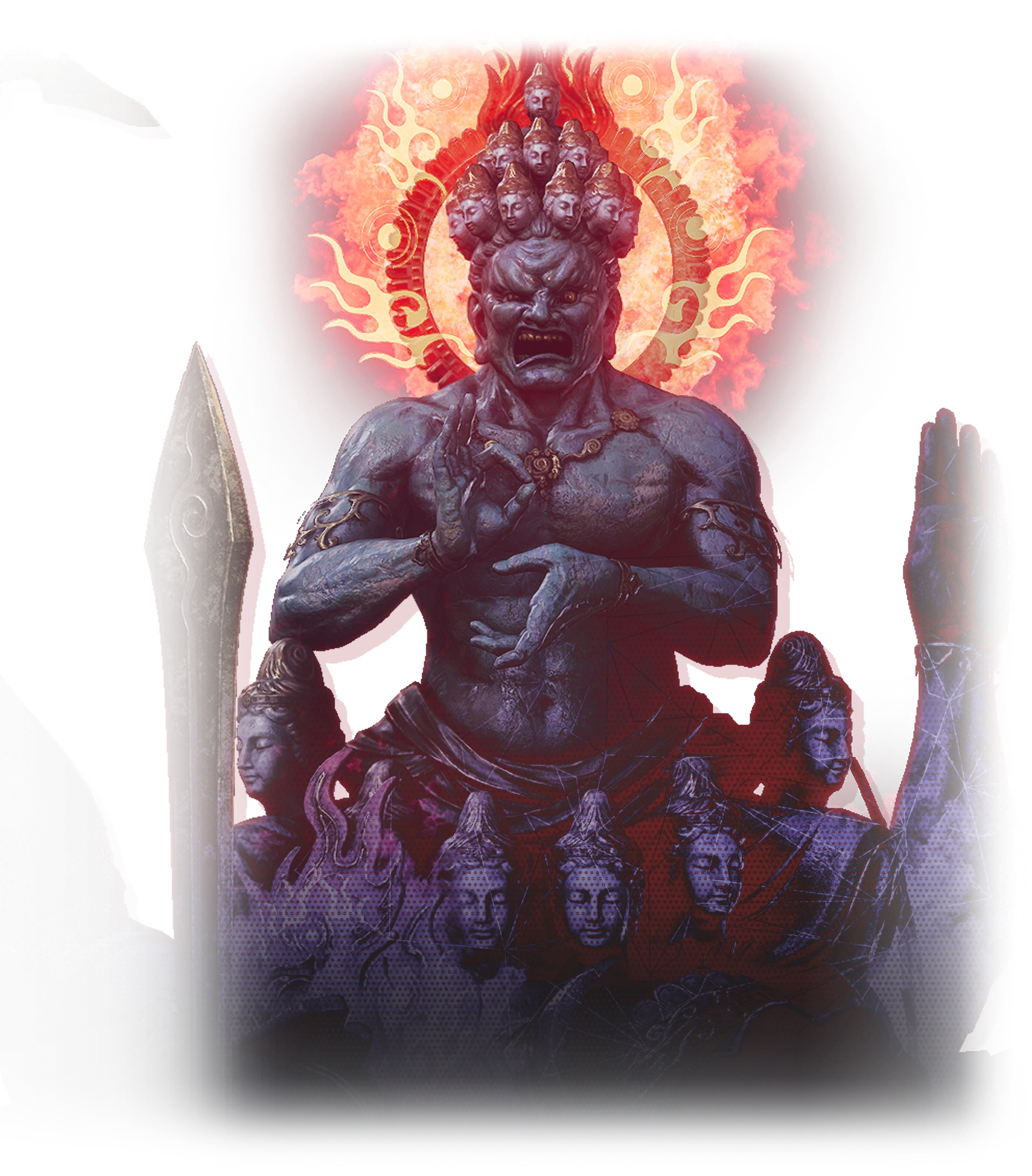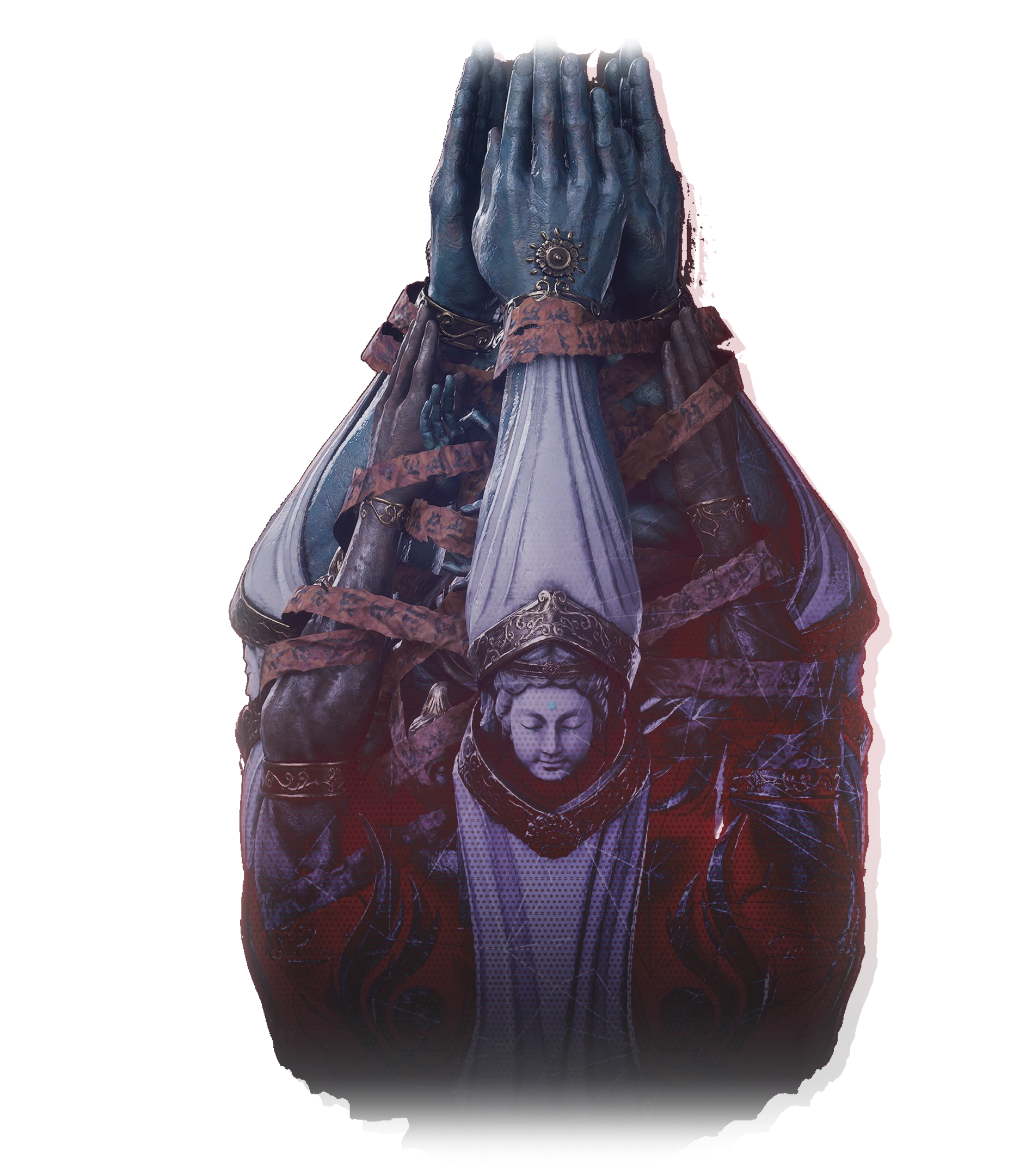 A deformed daemon covered in a shell resembling human arms, it drifts aimlessly about Fuuhaku Sanctum. Its intentions are unknowable to humans, but it is extremely aggressive if provoked.